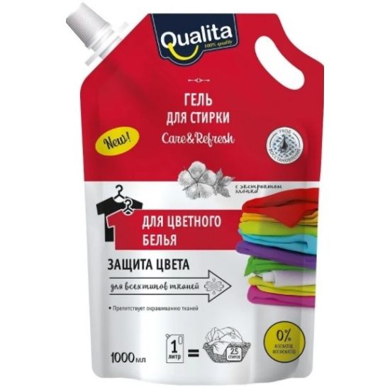 Средство жидкое 1л QUALITA гель для стирки цветного белья дой-пак 1/6 купить в Перми по низкой цене оптом и дешево с доставкой
