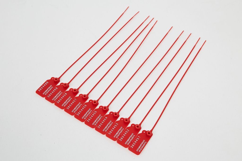 Пломба пласт. номерная, самофиксир., длина рабочей части 220 мм, красная 10/1000 купить оптом и в розницу в Перми