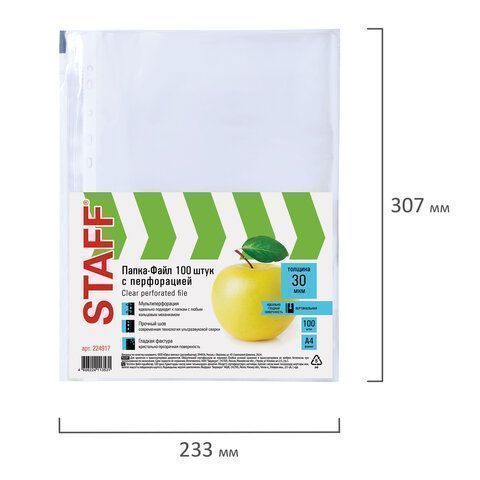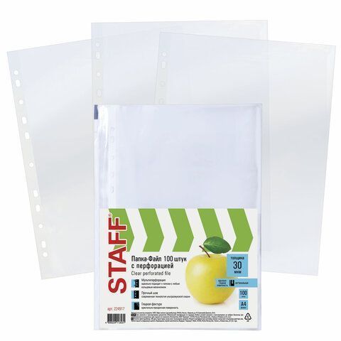 Перфофайлы А4 30 мкм гладкие STAFF 100шт яблоко 1/30 купить оптом и в розницу в Перми