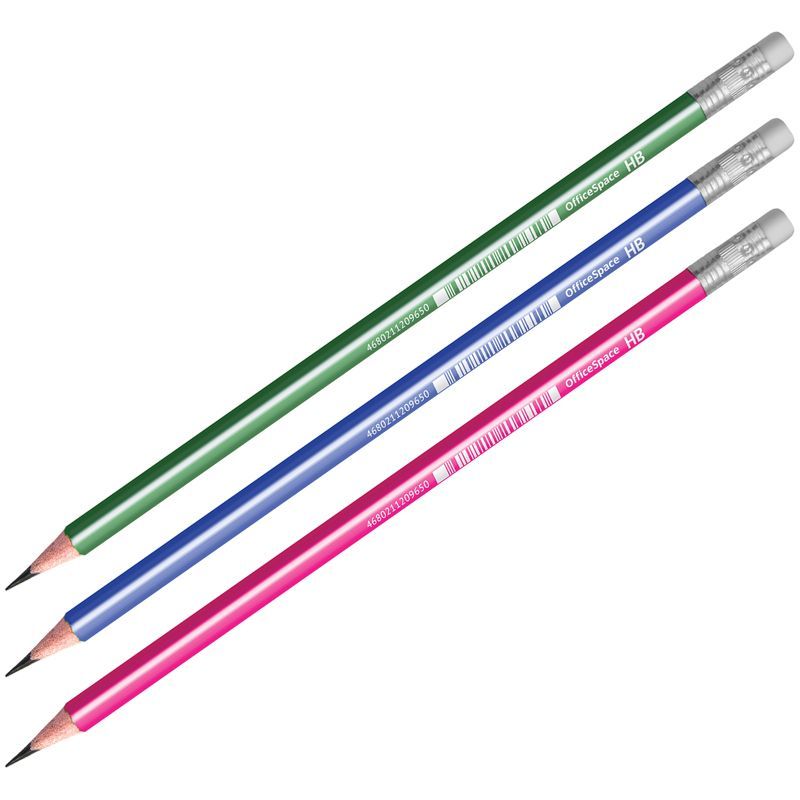 Карандаш ч/гр HB с ластиком, трехгранный, пластик, заточен, ассорти OfficeSpace 1/12/72 купить оптом и в розницу в Перми