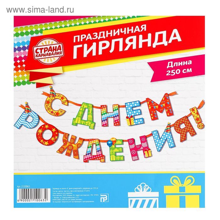 Гирлянды-буквы С Днем рождения, радужная, 250см, 1/250 оптом и в розницу в Перми, цены в каталоге с доставкой